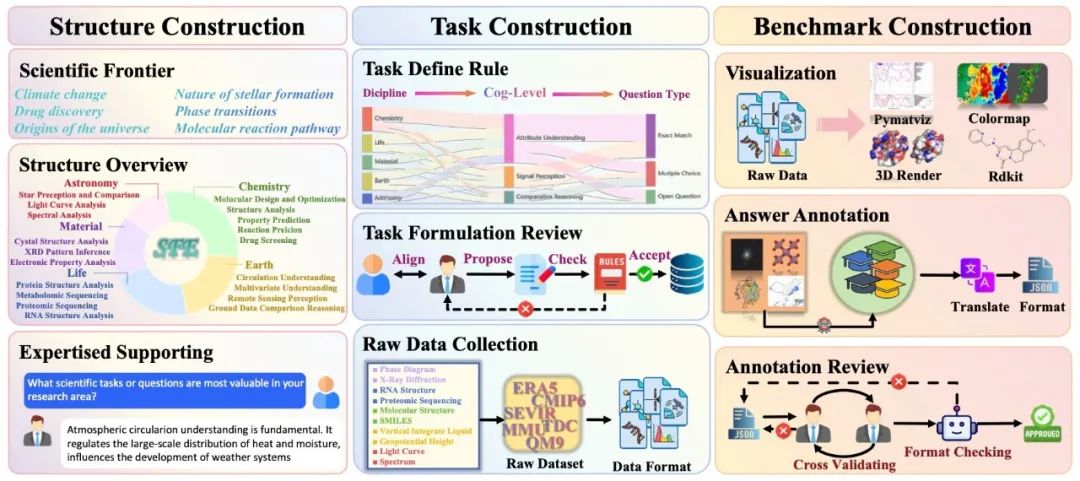 基于 SFE,进行渲染和可视化,这一结果进一步证明了 SFE 能有效区分不同模型的科学能力。知识广度则变化不大。通过专家设计和评审明确问题类型与认知层级;